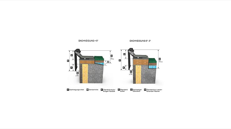 Die Standardlänge der Blende beträgt 4.000 mm. Die Blendenhöhen betragen 100 mm, 130 mm, 150 mm, 175 mm, 200 mm aus stranggepresstem Aluminium, mit den Abdecktiefen gemäß Tabelle. Der Anschluss der Folien- oder Schweißbahnen wird mit dem gleichem Zubehör ausgeführt, hierbei können Anschlussmaterialdicken von 1,0 – 5,0 mm eingesetzt werden. Der Anschluss wird mit 3 Klemmstücken á 200 mm pro Meter Blende ausgeführt. Das System entspricht, bei fachgerechter Ausführung, den Forderungen der Flachdachrichtlinie und der DIN EN 1991 – 1-4:2010-12, Windlasten. Hinweis: Nach dem Eindrücken der Klemmstücke wird ein Abrutschen der Schweißbahn / Folie vermieden, d.h., der Dachrand ist funktionssicher eingedichtet.